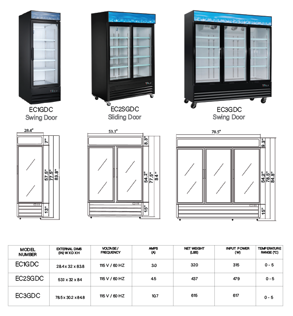 * Self-closing glass door fitted with easy to clean, replaceable magnetic balloon gaskets