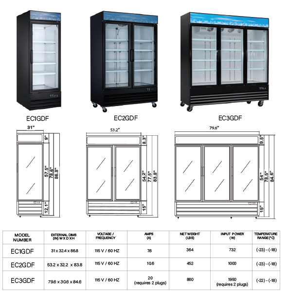 * Self-closing glass door fitted with easy to clean replaceable magnetic balloon gaskets